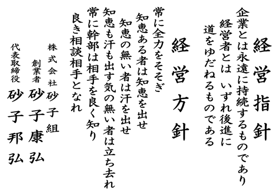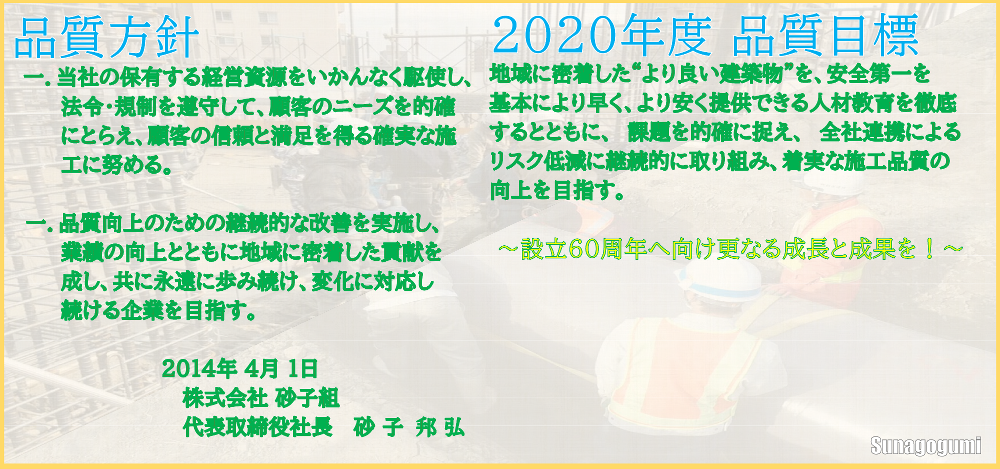 | 1994年(平成 6年) | 5月 砂子組グループ安全衛生委員会発足 9月 創業者 砂子康弘逝去により代表者変更 |