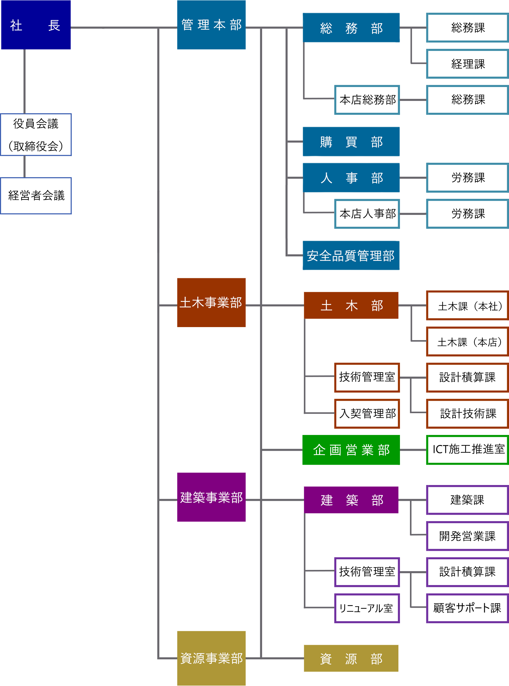 現在、人財の成長を大きな企業運営の軸にしながら、IoT化にいち早く取り組み、三方良し(住民良し、発注者良し、企業良し)の事業推進をし、技術者においてはシッカリとした工程管理を構築し、i-Con時代の中では積極的に先に向けての挑戦を継続中であります。どの事業部門におきましても、ICTの施工、3D化等安全施工、均一的な施工品質、そして生産性の向上を目指しています。